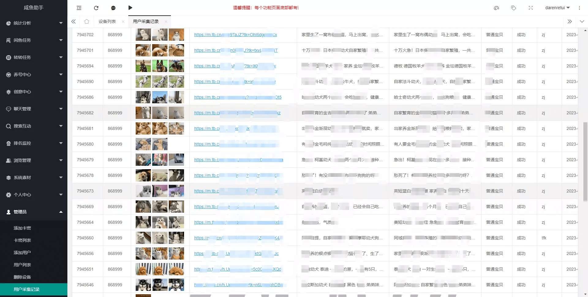 常见的有莆田系,fk表,但是今天不说这两个,拿一个卖宠物的举例,他在我这拿群控大概有400个号稳定在用。收益他给我说的大概月入12w,卖狗,少量卖猫。